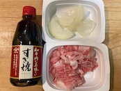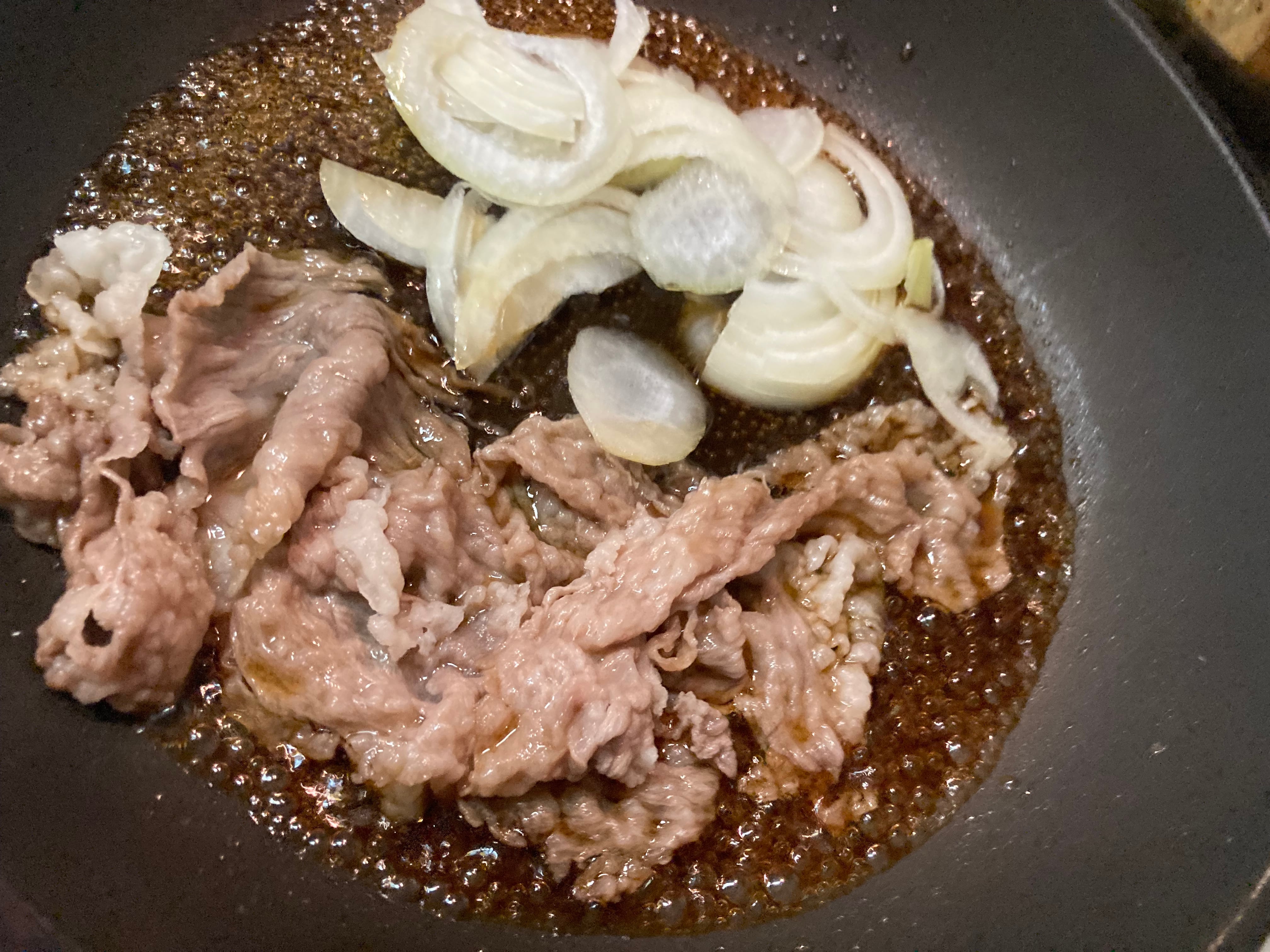 ⑤強火でフライパンを加熱し、すき焼のたれと玉ねぎを入れてタレが沸騰したら