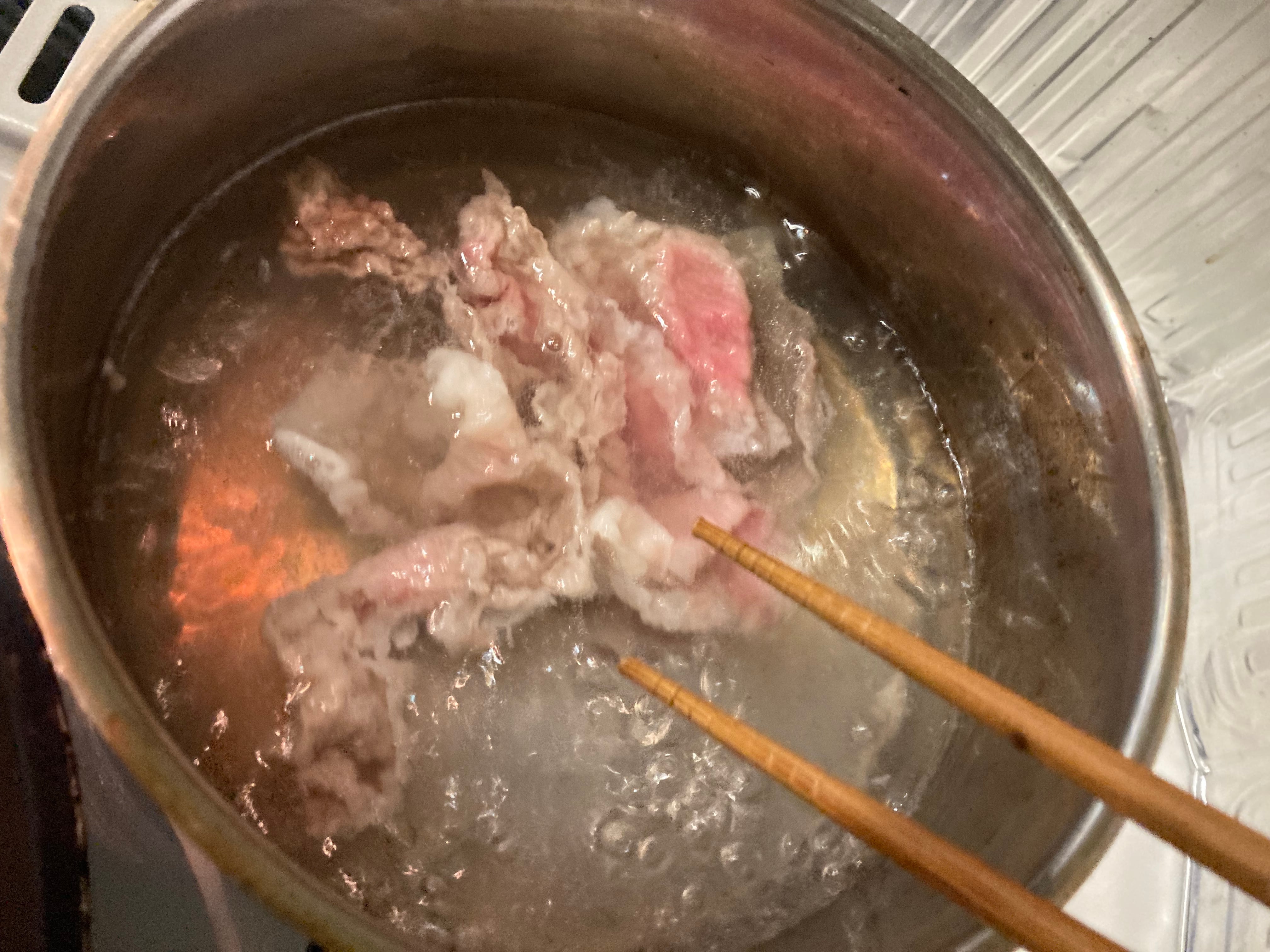 ➃牛肉を沸騰したお湯に1/4パック入れて10~15秒湯通しにてすくい取るを