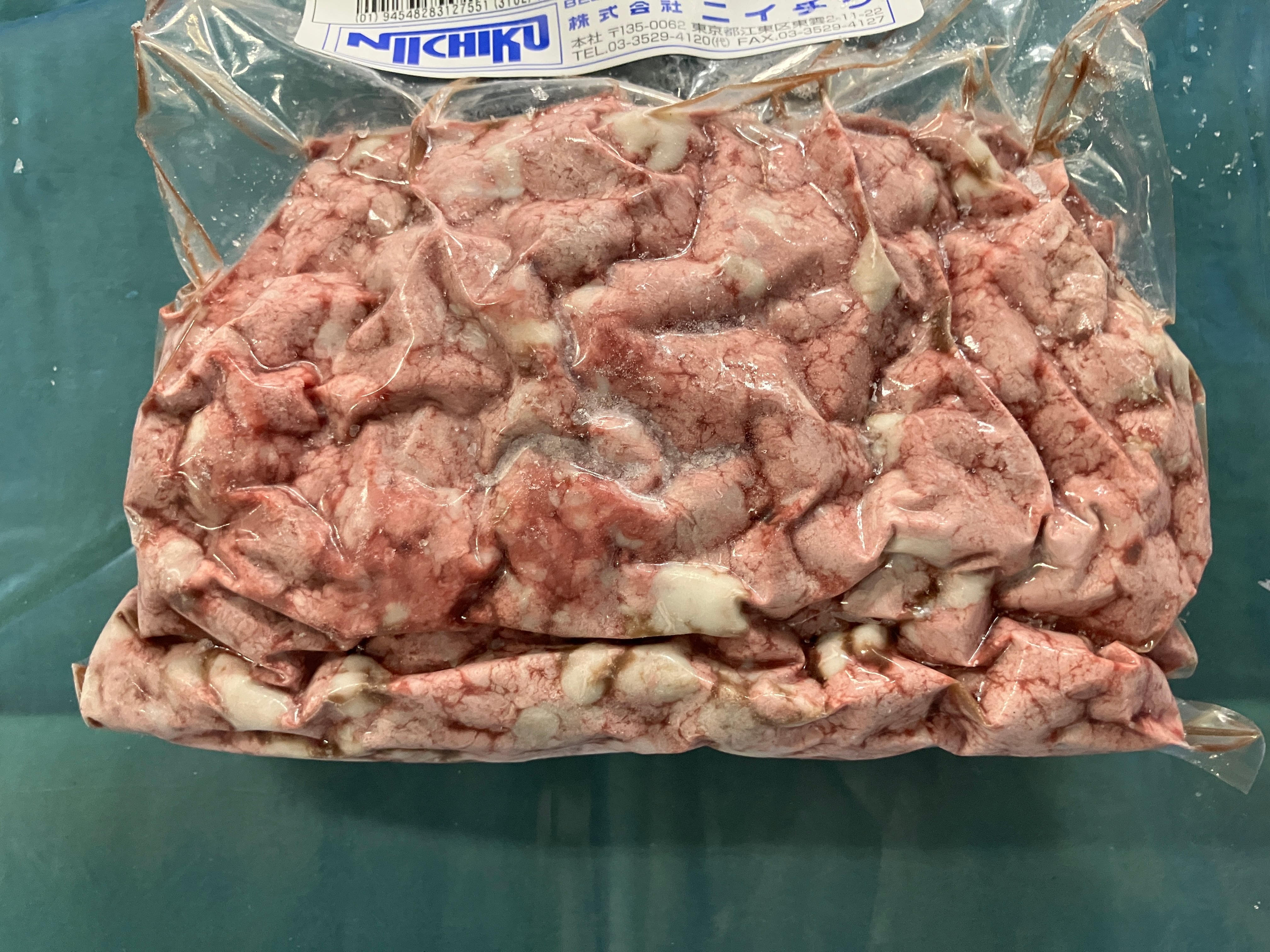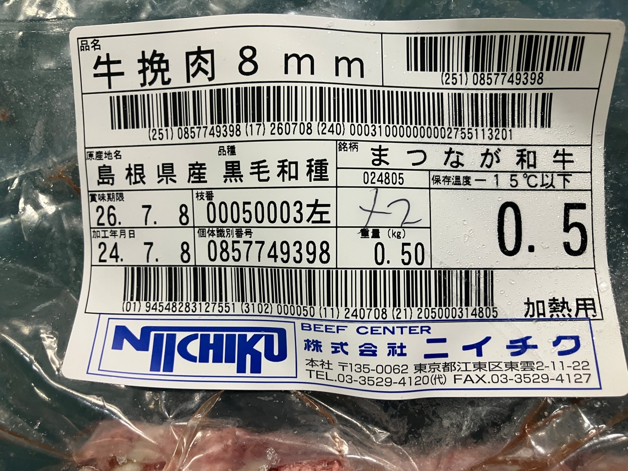 こちらの製法は和牛肉を8㎜にて挽き、真空パックし、アルコール液で短時間凍結しています。