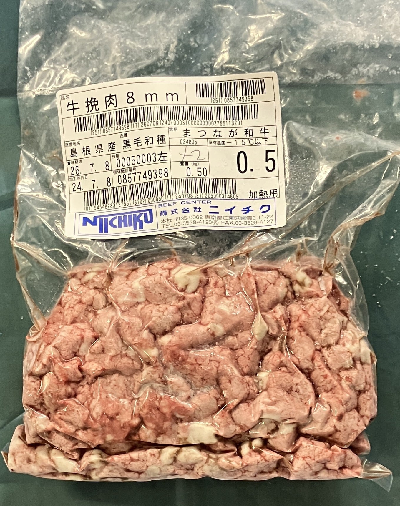 こちらの製法は和牛肉を8㎜にて挽き真空パックし、アルコール液で短時間凍結しています。