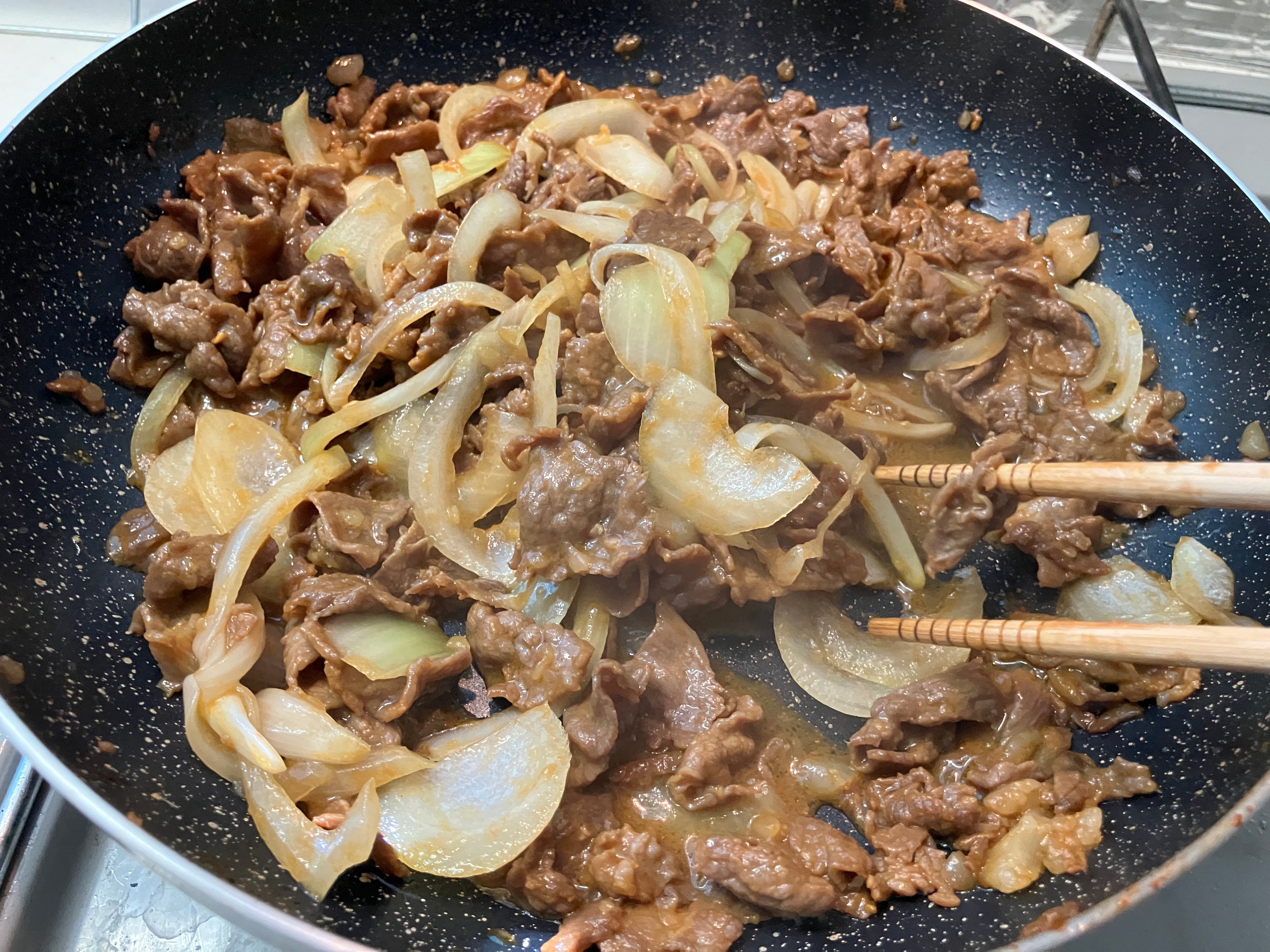 お肉をフライパン(中火)で4~6割程度炒め、スライスした玉葱を入れ、