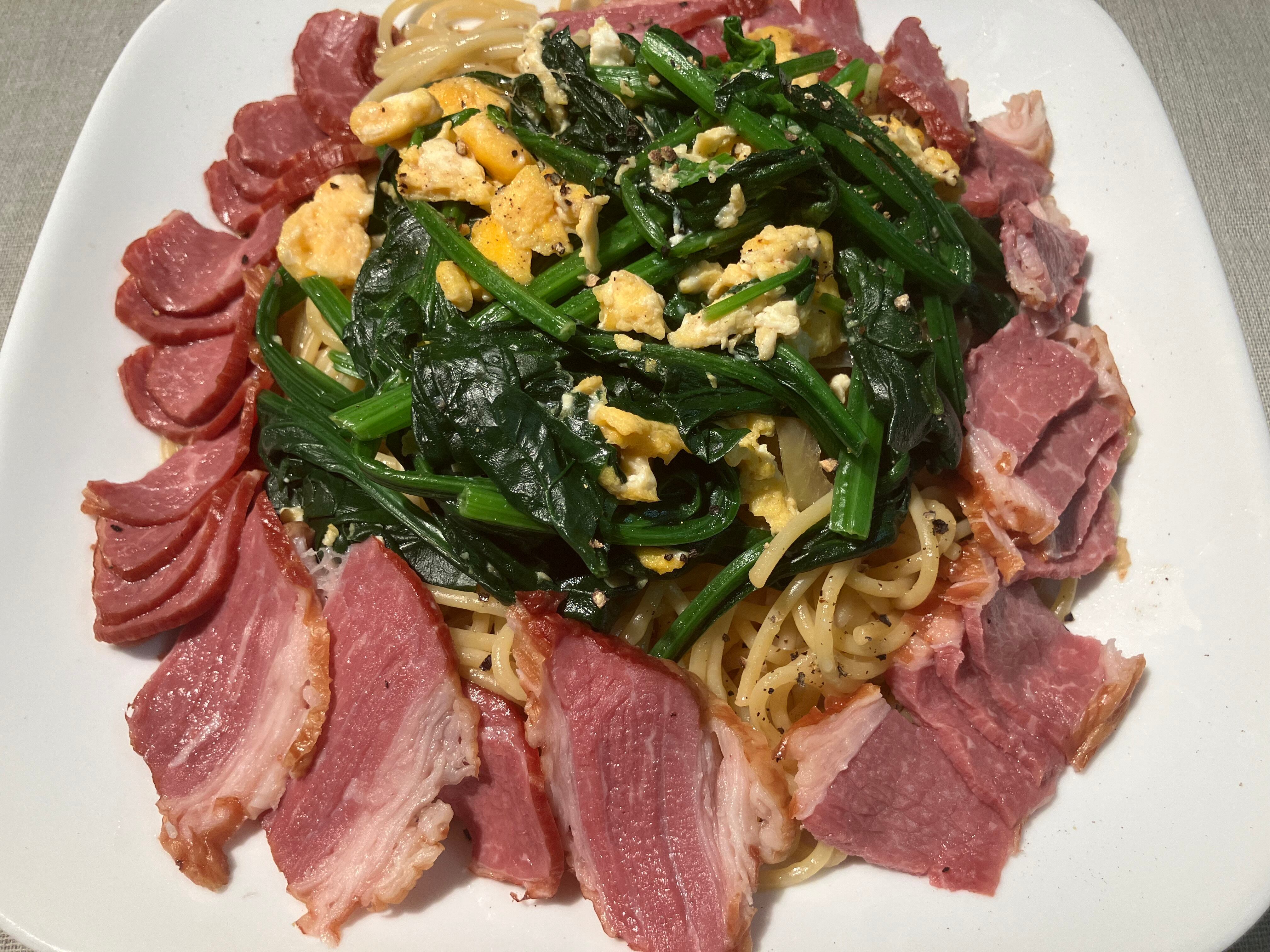 黒毛和牛ベーコンとほうれん草のパスタ
